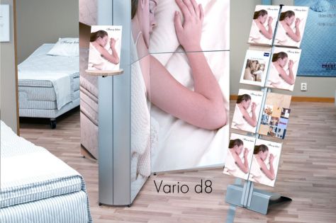 Vario d8 offers a choice of portable literature racks. Light weight and compact, it pack away into carrying bag that could easily be taken on sales trips. All this convenience has been achived without compromise to elegant and attractive design.