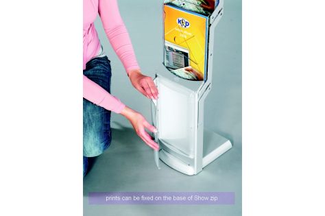 Show zip has a 3 brochure pocket made of die cast polycarbonate and a telescopic bar with bannerblock for banner fixing. The bar is adjustable from 1.3m to 2.4m, accoridng to the banner height with 700mm width.