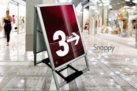Snappy is a double sided poster display stand which is made of silver-coloured anodised aluminium.