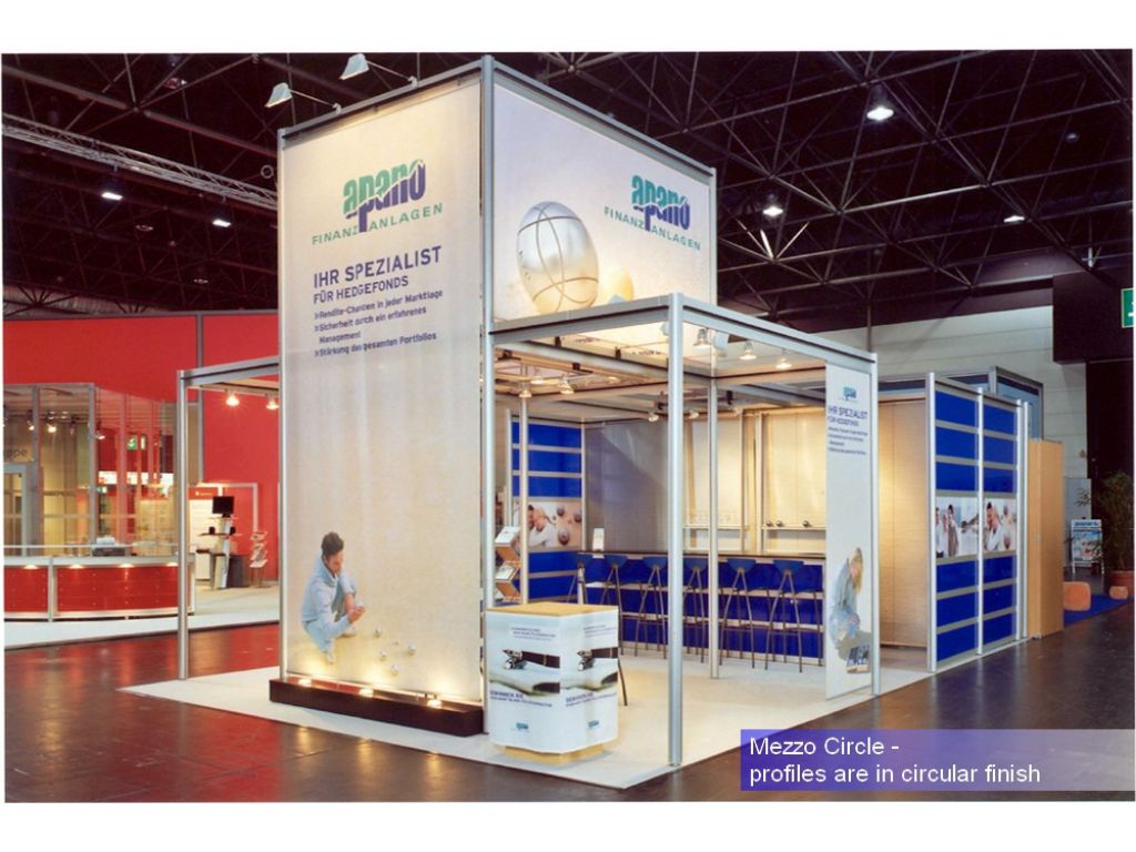 Mezzo Square / Circle is a high grade aluminium profile system which is most suitable for construction of exhibition panel, display racks, booth construction and interior shopfitting.