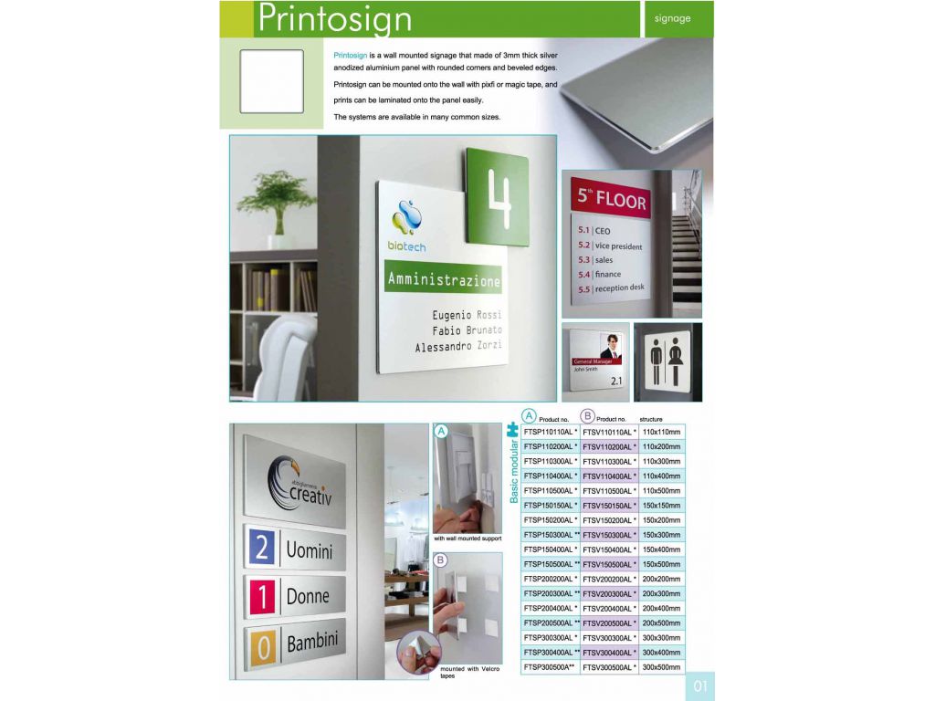 Printosign is a wall mounted signage that made of 3mm thick silver anodized aluminium panel with rounded corners and beveled edges.