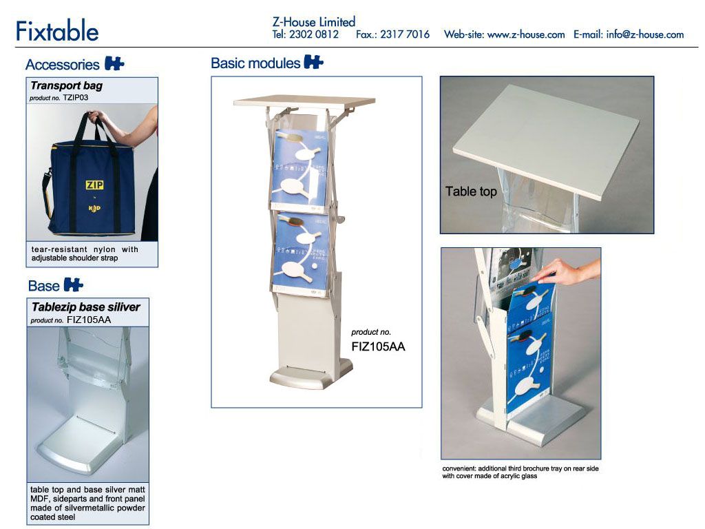 Fixtable is the combination between a counter and portable brochure rack. The stable 105cm height of the table is set up in one time. On the front side there are two A4 brochure pockets made of uv and shock resistant die cast polycarbonate, and a third pocket with covering in acrylic glass is on the rear side for confidential handout.