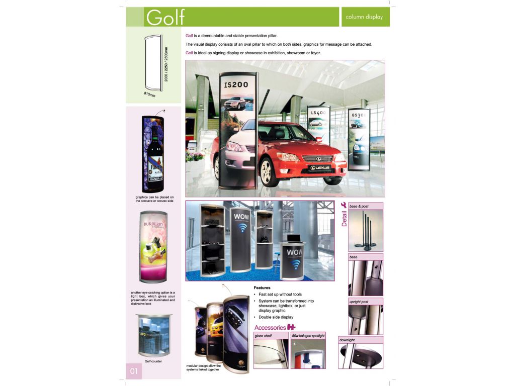 Golf is ideal as signing display or showcase in exhibition, lighting pillar in showroom or foyer.