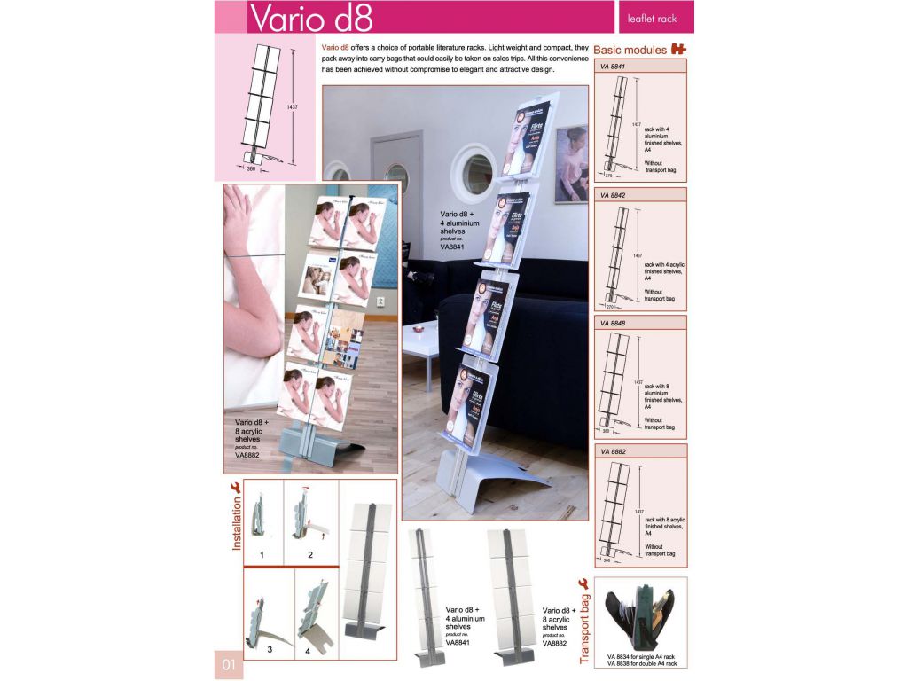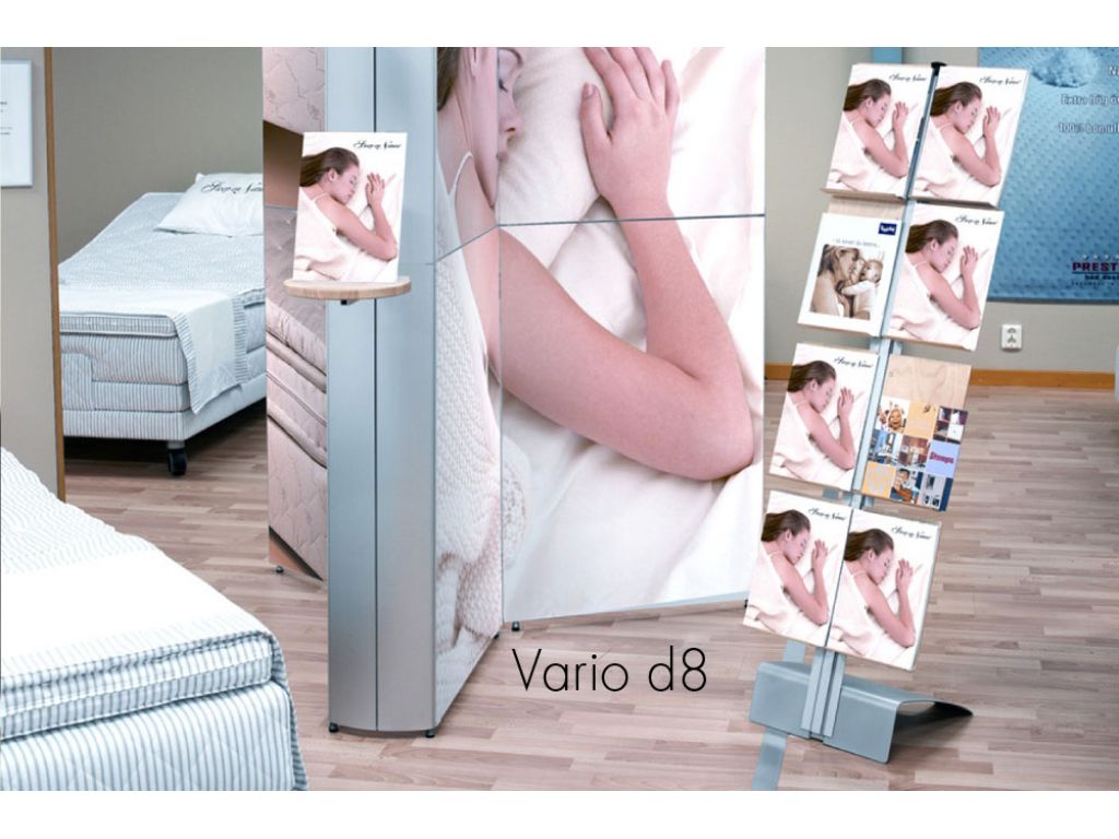 Vario d8 offers a choice of portable literature racks. Light weight and compact, it pack away into carrying bag that could easily be taken on sales trips. All this convenience has been achived without compromise to elegant and attractive design.