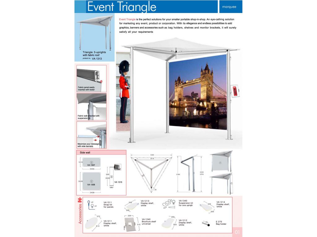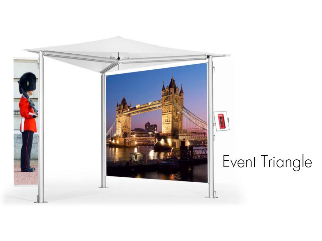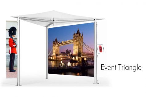 Event triangle is the perfect solutions for portable marquee. With its ellegance and endless possibilities to add graphics, banner and accessories such as shelves, monitor brackets, literature shelf etc, it will surely satisfy all your requirments.