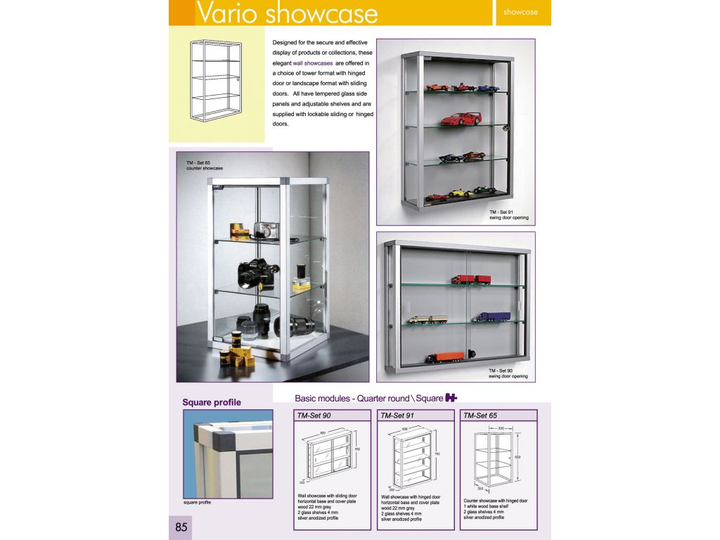 Designed for the secure and effective display of products or collections, these elegant Vario showcases are offered in a choice of tower format with hinged door or landscape format with sliding doors.