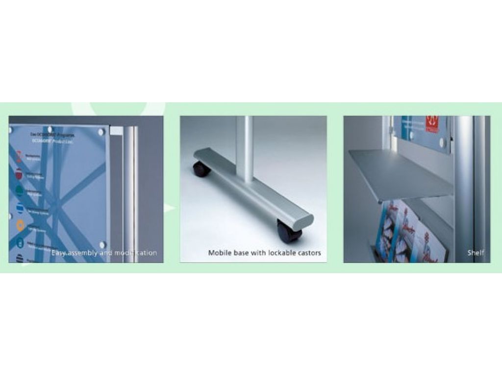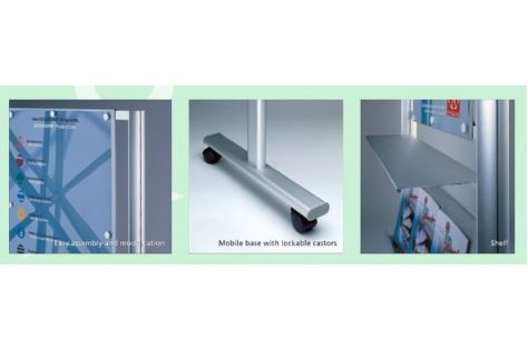Vario promotion stand is made of aluminium in matt anodized finish and the stand equipped with a magnetic adhesive board for poster, horizontal shelf for product display and slope shelf for literatures.